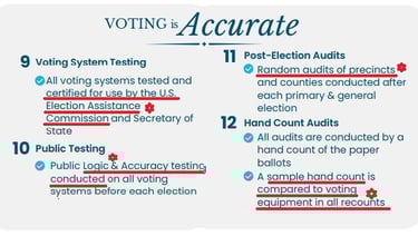 10) Public Logic and Accuracy Tests—These are done in advance of each election, but they are extremely simple, and only verify that each candidate and issue on the ballot is capable of being read and recorded. L&A tests assure basic functionality but they do nothing to assure accuracy beyond making sure the tabulation machine was programmed correctly for a particular election.