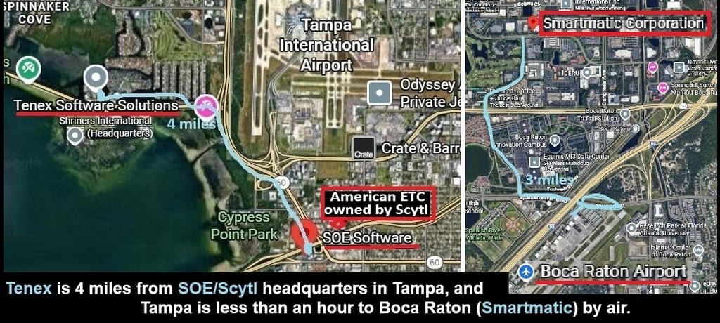 Why does the close proximity between Tenex, SOE Software (Scytl), and Smartmatic matter? Software collaboration can easily be conducted over the internet. But criminal organizations, secret societies, fraudsters, and especially cryptography experts know that the internet is a non-secure medium of communication. So fraudsters developing secret methods of rigging elections, know that there is no substitute for in-person communication, whenever felonious activities and racketeering are concerned.