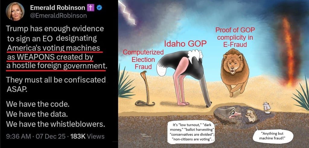 Unfortunately, most Idaho’s political leaders refuse to face up to the reality of machine fraud, and offer false reassurances to Idaho voters instead of effective reforms. In spite of overwhelming evidence of systematic computerized fraud, Republican leaders accept any other excuse for MAGA losses in solid red districts, to avoid addressing e-fraud. Both RINO and MAGA wings of the Republican party, are complicit, so the very people that conservatives depend on to fight for fair elections, are enabling election fraud instead of opposing it.