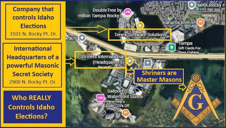 Tenex, the software company that manages Idaho's elections, is located in Tampa, Florida in close proximity to Scytl and Smartmatic, two foreign-controlled election technology companies with dubious reputations. Tenex is also one block away from the Shriner's International Headquarters. Shriners are high order Freemasons.