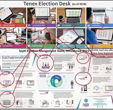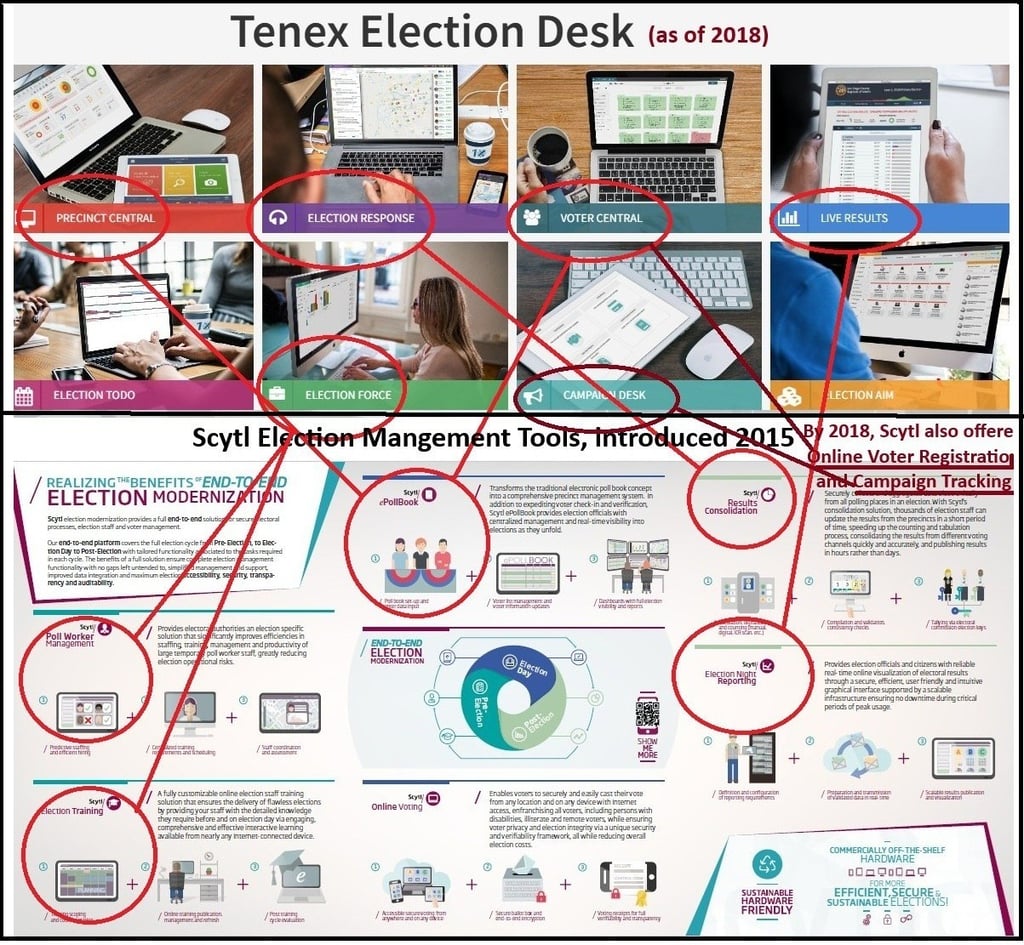 The above report on Scytl is from a 2015 Berkshire Hathaway newsletter. Since that time Scytl has undergone several changes in ownership and changes of product line. But the state of Scytl technology in 2012-1016 is important, because that is the time it most likely began transfering its software to Tenex and perhaps other American Election Technology companies. The diagram below shows that Scytl's Election products in 2015, were very similar to thosed developed by Tenex a few years later.