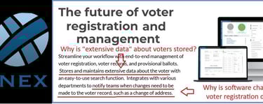 2) Idaho's Voter Roll Maintenance Software provides for Mass Data Collection and Storage. The company that runs Idaho's election management software is Tenex Software Solutions. If you go to its web page, and review the description of its All Inclusive Voter Management Platform, it is clear that the Tenex "Voter Central" database stores and processes "extensive data about voters", including much, much more information than what relates directly to voter registration. Why is this?