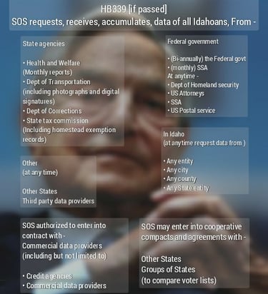 In 2024, Idaho legislators passed House Bill 339. It replaced 34-433, a simple paragraph requiring the board of health to report data on deceased residents, with a long, complicated statute authorizing the Secretary of State to collect, store, and process almost unlimited amounts of information about all Idaho voters, and to share it with unnamed states, NGOs, and private corporations. It is shocking how broad-ranging this bill is, and how much collection and sharing of personal data is allowed.