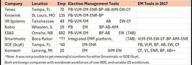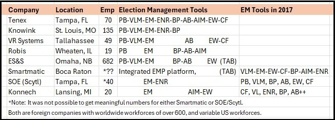 2) Many of the companies have very similar “Election Management” product lines, with similar features. And almost all are too small to have developed such advanced software independently. Could it be that some of the ETC companies who offer Elecronic Poll Books and Election Management Tools are leasing their software from the same company? Could it be that the company that developed these sophisticated tools wants to create the "illusion of choice" so their monopoly over Election Management software is not obvious?